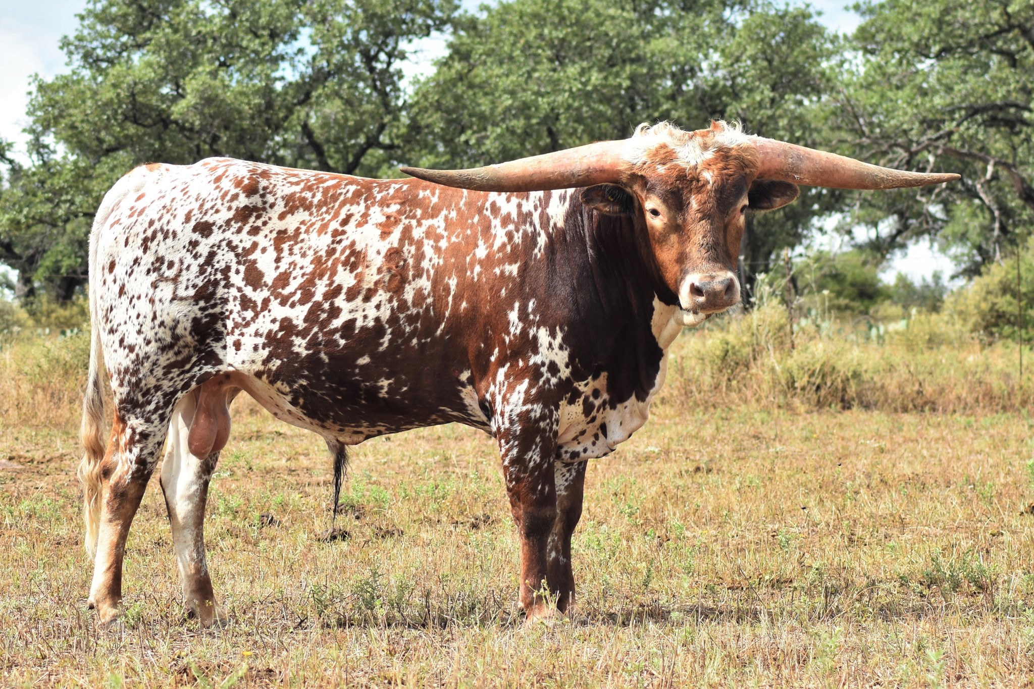 A wonderful cross of two amazing Longhorns, FIFTY-FIFTY BCB x 95.25"TTT D/O MISS GRANDE. Maternal brother to the exceptional aver 100"TTT Helm Miss Impressive that sold for $160,000 at the 2023 HV Fort Worth Sale. Beautifully marked with great color, built like a tank with perfect conformation, has an amazing disposition, and his offspring speaks for itself just look at his progeny.