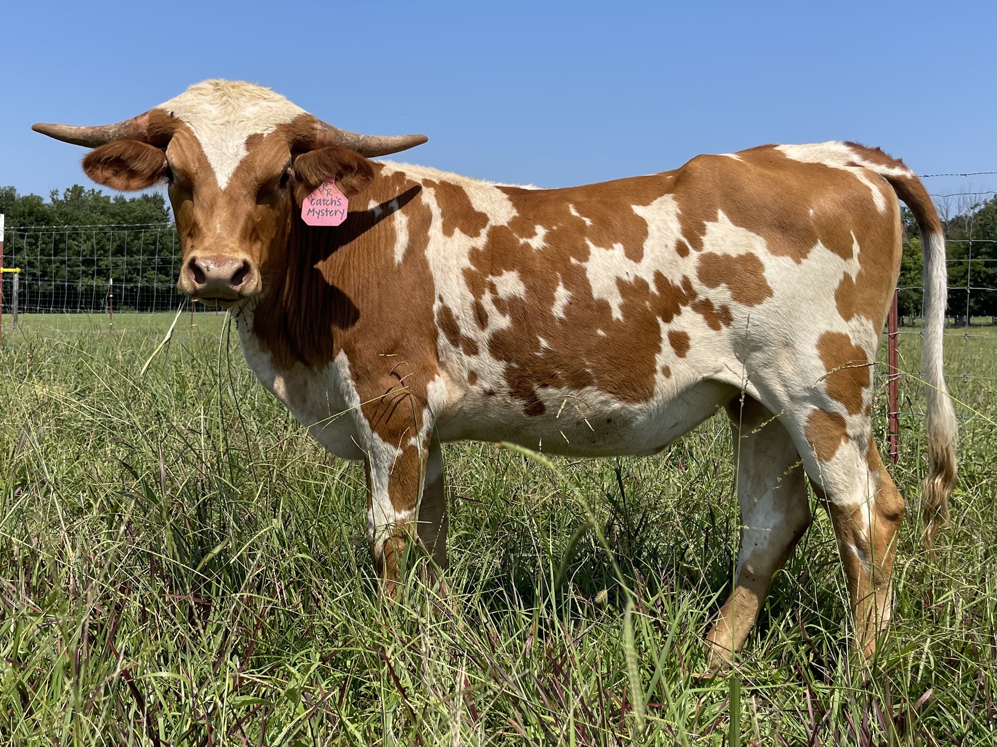 Beautifully marked heifer sired by our bull CATCH, we are excited about her structure with thick bones, she is tall, and at day one we can tell she is a well made heifer. On the top Catch bringing in three legends, Cowboy Catchit Chex who is a full brother to the longest bull ever the over 105"TTT Cowboy Tuff Chex, the 90"TTT Drag Iron, and the over 100"TTT BL Rio Catchit cow, on the bottom she goes to the 87"TTT PCC Rim Rock, and JP Rio Grande. With stacked genetics and color it's going to be fun watching this gorgeous girl grow and we couldn't be happier with how she looks.