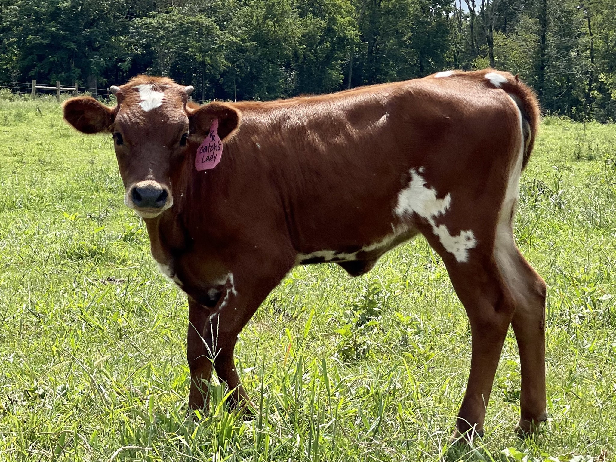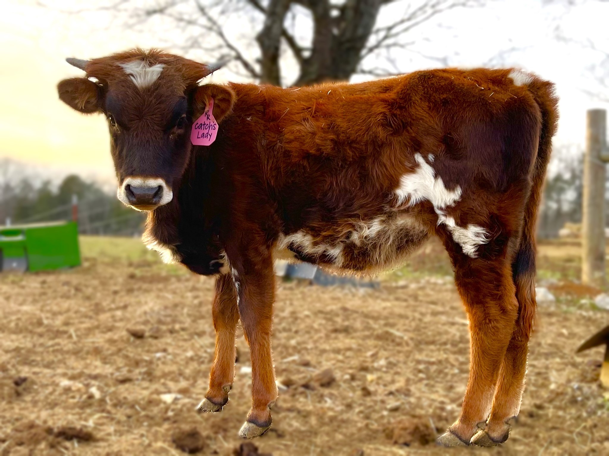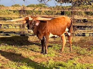 This beautifully colored lovely lady is built like a tank, has an outstanding pedigree and comes from a VINDICATOR daughter with almost 90" TTT. Putting on almost 28" of horn in less than a year, she proves to be following in her dam's footsteps, even after breaking off almost 4" of horn. Aside from her extremely docile temperament, love of being hand fed and great conformation, her pedigree is the icing on the cake! On bottom, she brings in WS Jamakizm, ECR Eternal Tari ( a daughter of the GREAT TARI GRAVES FM 49), VJ Tommie (Unlimited), Gunman and JR Sequential to name a few. On top, her sire Catch brings in Expedite, Drag Iron, BL Rio Catchit, a line of the Horseshoe J cows, Bwana Chex and the three Chex brothers Cowboy Catchit Chex, Cowboy Chex and Cowboy Up Catch. She would definitely be a pleasure to watch mature and look forward to her future offspring, especially if you are looking to add horn in your program!