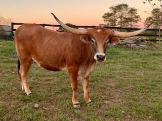 This brindle beauty is not only tall and large bodied, has the perfect temperament and loves to be scratched and hand fed, has a stellar pedigree and horns that are going in the right direction and starting to hook, she has put on almost 30" of horn in less than 7 months. Sired by award winning bull, CATCH, to bring in Expedite, Cowboy Chex, BL Rio Catchit, a line of Horseshoe J cows, JP Rio Grande, Drag Iron, WS Jamakizm and Peacemaker 44 on top. On bottom, she goes to BL Ringa DInger, GF Heavy Hitter and Watson 167. Her stacked pedigree and perfect body and disposition ensure she'll be one of your favorites and a great asset to your program!