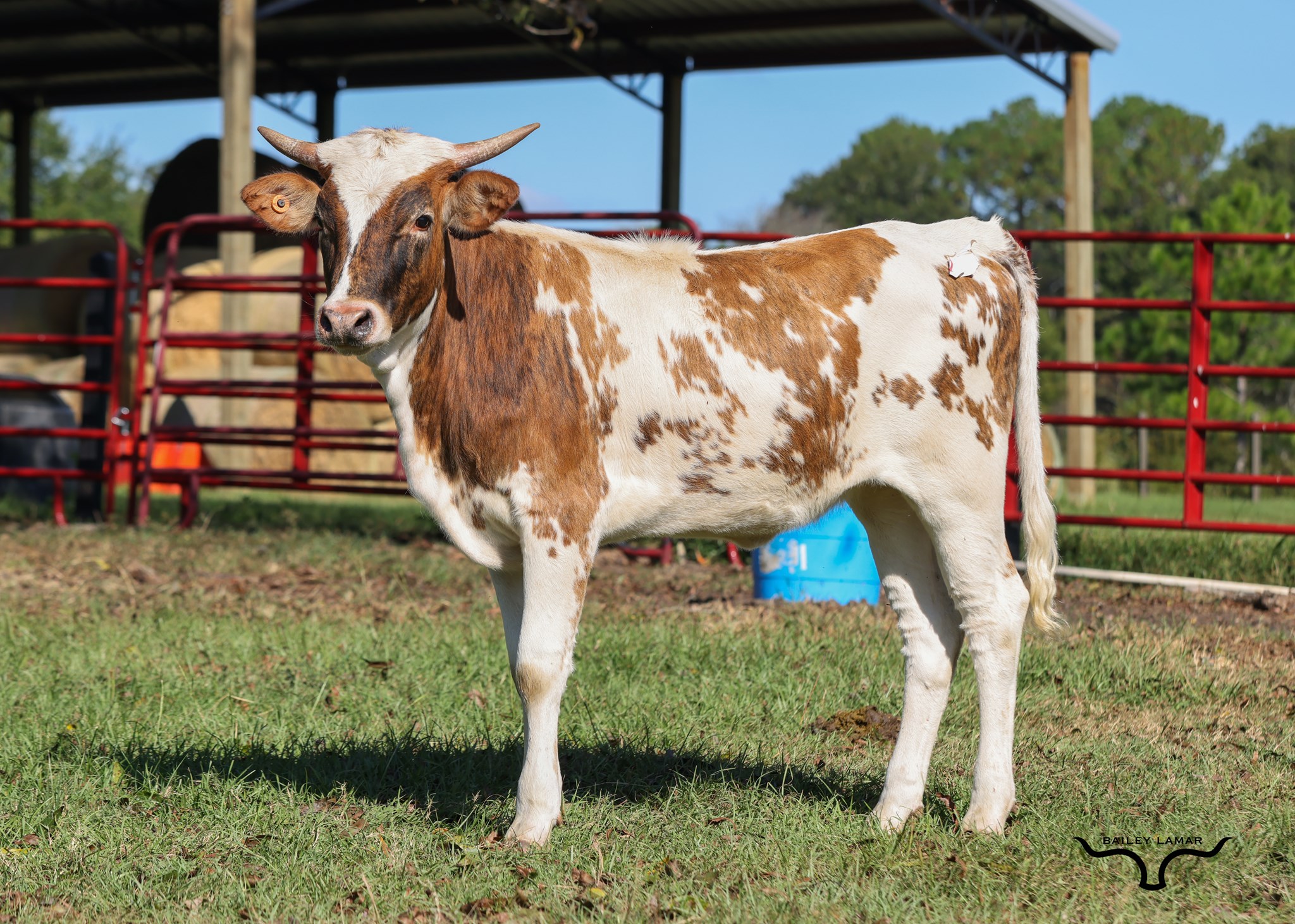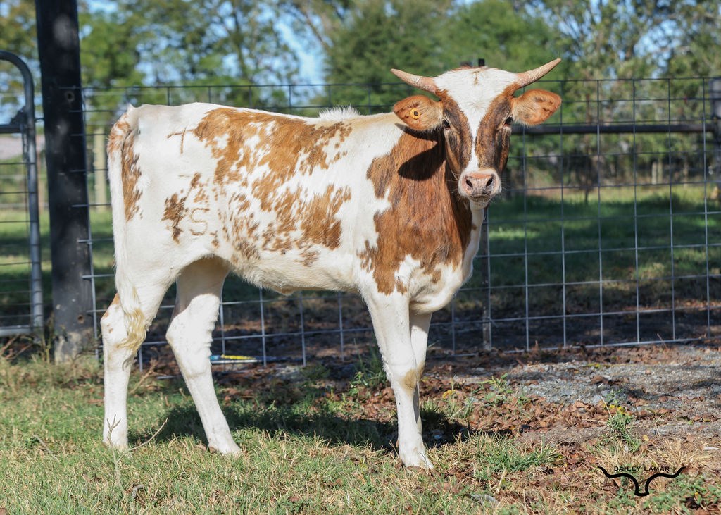 Beautiful brindle heifer out of an over 80" twisty horn cow bred by Jimmy Jones. Her dam has some heavy hitters in the pedigree. The sire is an over 96" bull out of a 105" dam. This well built heifer has it all for horn, futurities, and pedigree.