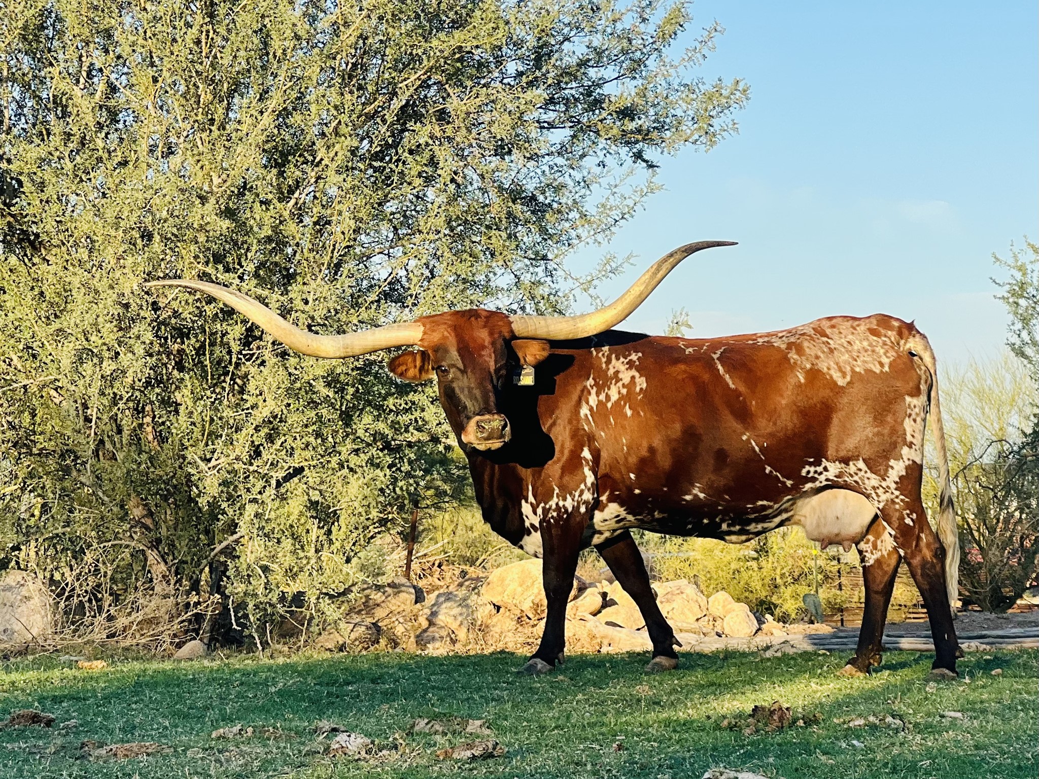 A beautiful cow from the legendary Bob Loomis ranch. Shes a really great cow lots of color horn & milking ability. Whats not to love! She will have a lot to do with our program’s future! She was 85” on 3-22-2021