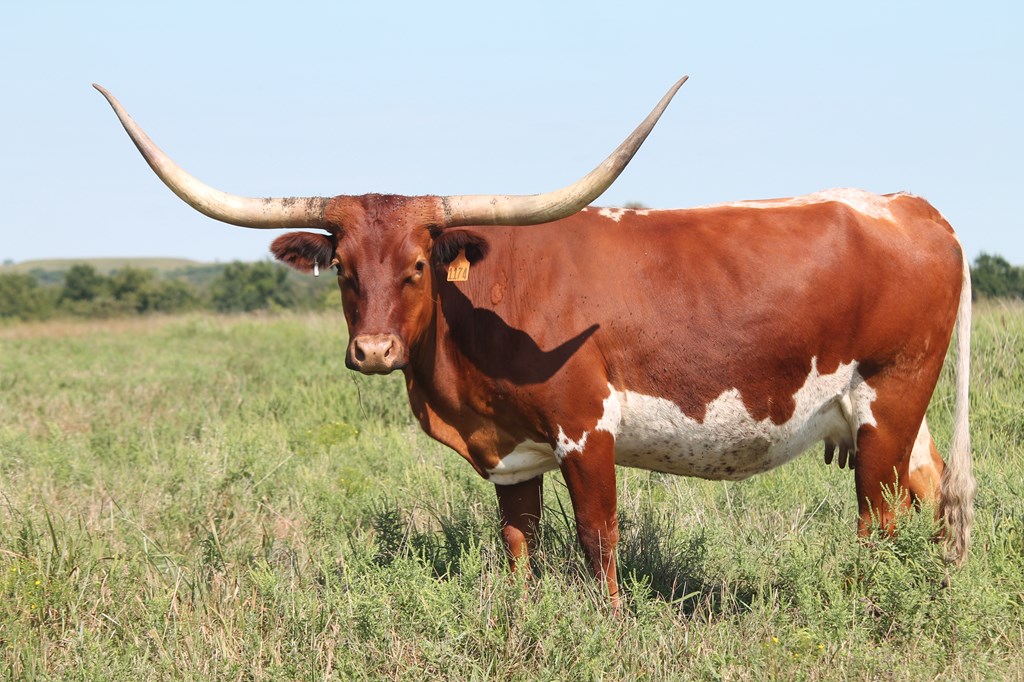 A FANCY YOUNGSTER WITH EXTREME HORN GROWTH AND A INCREDIBLE PEDIGREE OF HORN PRODUCING ANCESTORS! THIS HEIFER IS VERY COMPLETE AND NOW HAS A HEIFER CALF AT SIDE BY "MIDNIGHT" & IS BEING EXPOSED BACK TO HIM FOR A 2016 SPRING CALF!