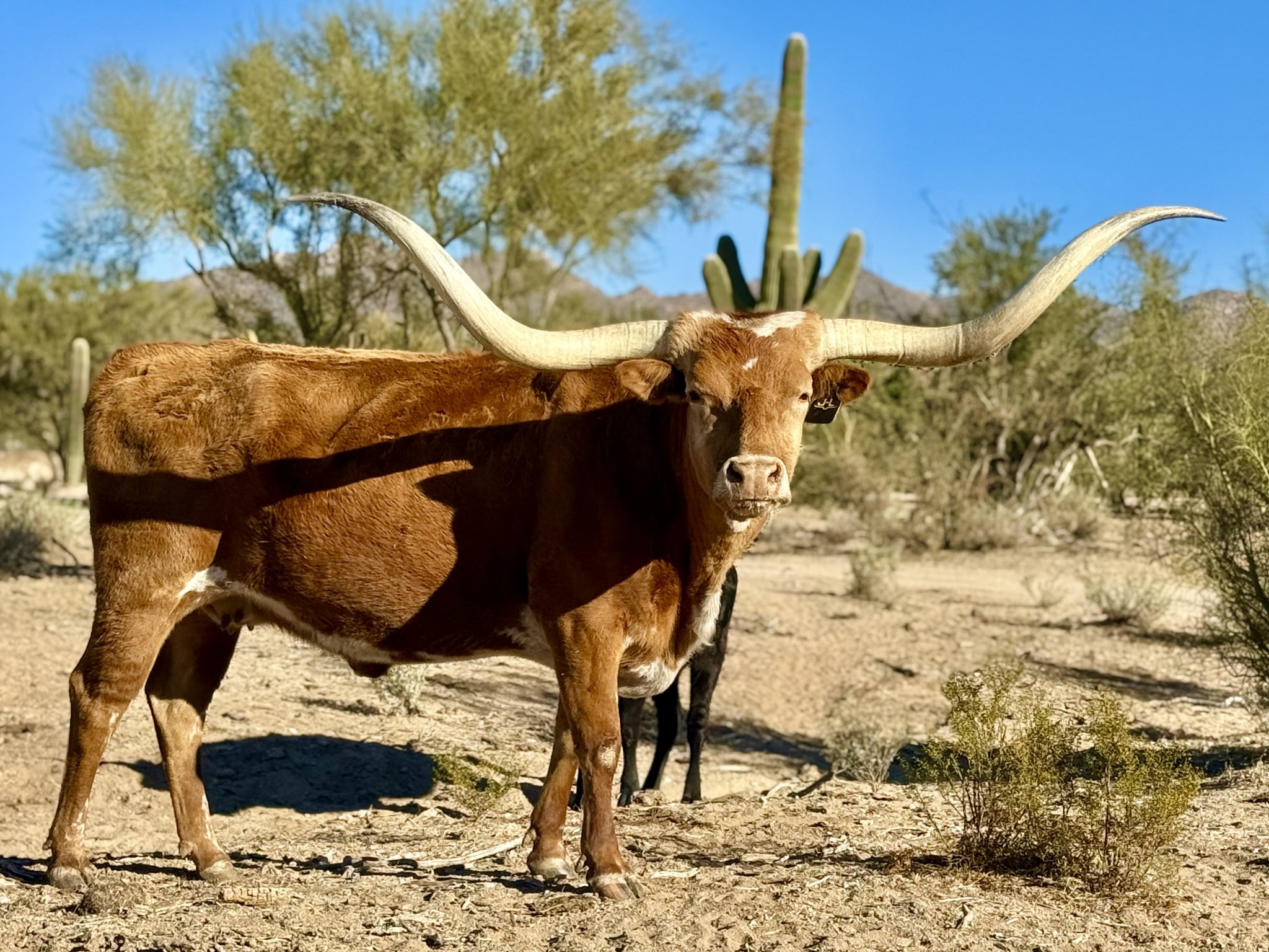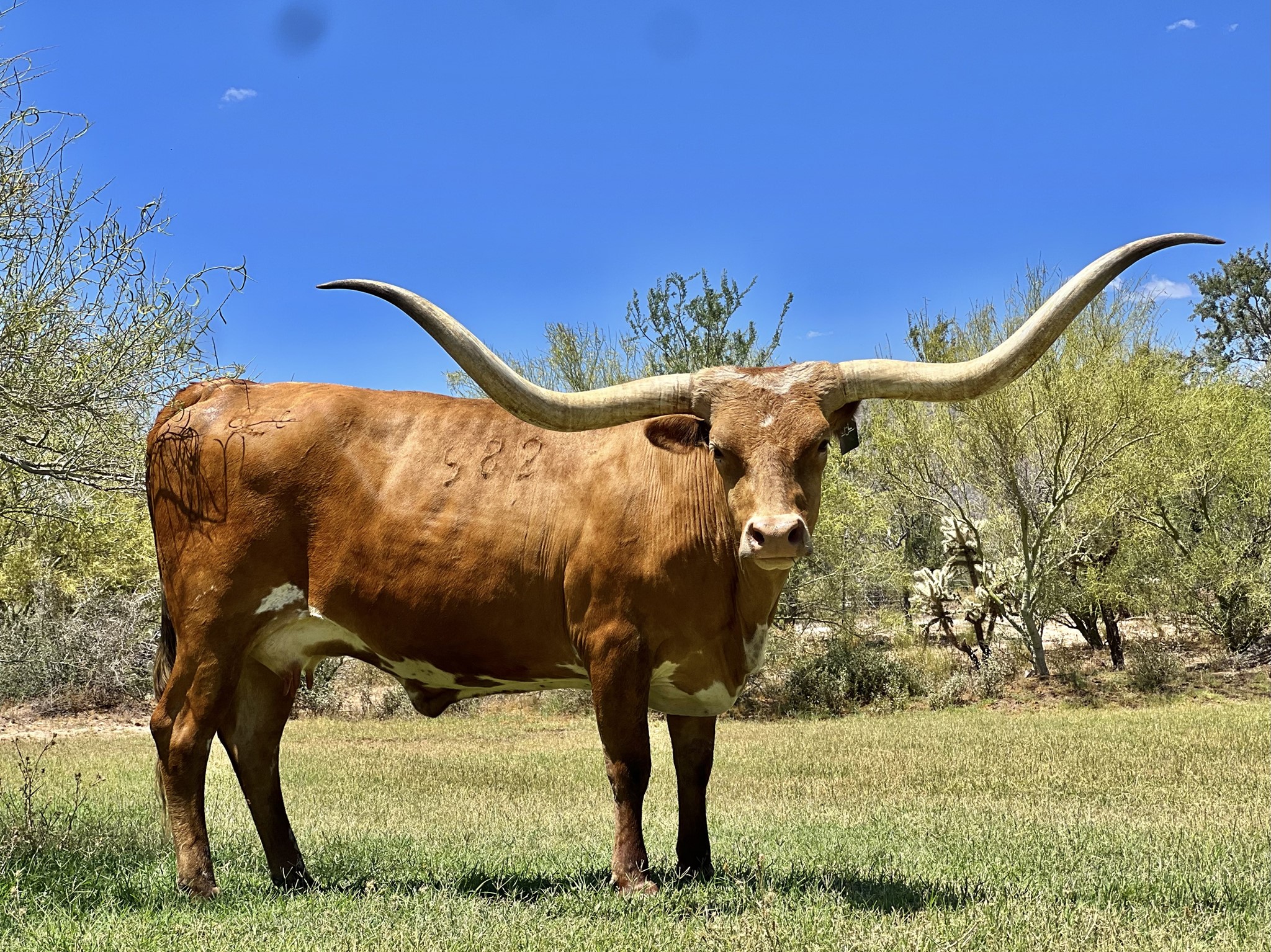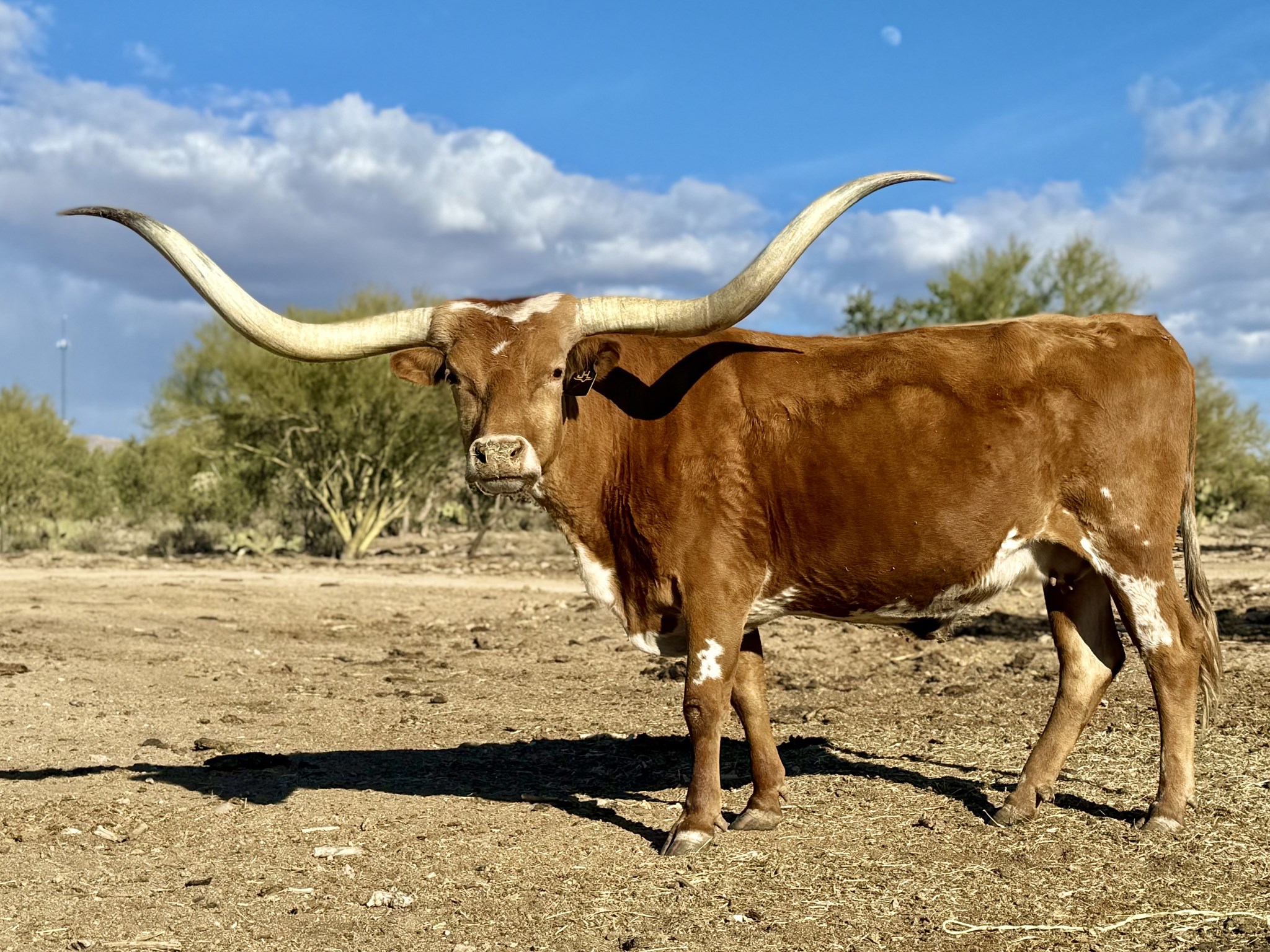 A large framed FIFTY-FIFTY daughter, who on the bottom side goes back to Cowboy Up Chex along with Coach. Her calves always end up being flashy & just as gentle as she is. Almost 90” of very twisty horn and a great mother to her babies. Currently bred to Delta Lucky Ace!